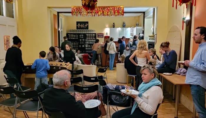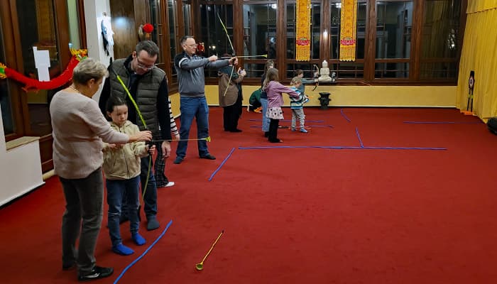 Das chinesische Neujahrsfest 2026 in der Wujia war ein voller Erfolg. Mehr als 50 Besucher aus dem Verein und Interessenten von außerhalb hatten viel Spaß bei allen Aktivitäten. Das Bogenschießen war der Renner bei Groß und Klein. Die Jiaozi wurden so schnell aufgefuttert, dass wir mit den weiteren Schalen gar nicht mehr aus der Küchenzeile heraus kamen. Auch die Versuche mit Scherenschnitten des Feuerpferdes und golden ausgemalter Vorlage des Symbols Fu gelangen gut. Die Idee einer kurzen Feier wurde zu einer ausgedehnten Feier, welche erst gegen 22:30 Uhr bei bester Stimmung zu Ende ging. Wir bedanken uns bei allen die dabei waren und mit uns feierten!